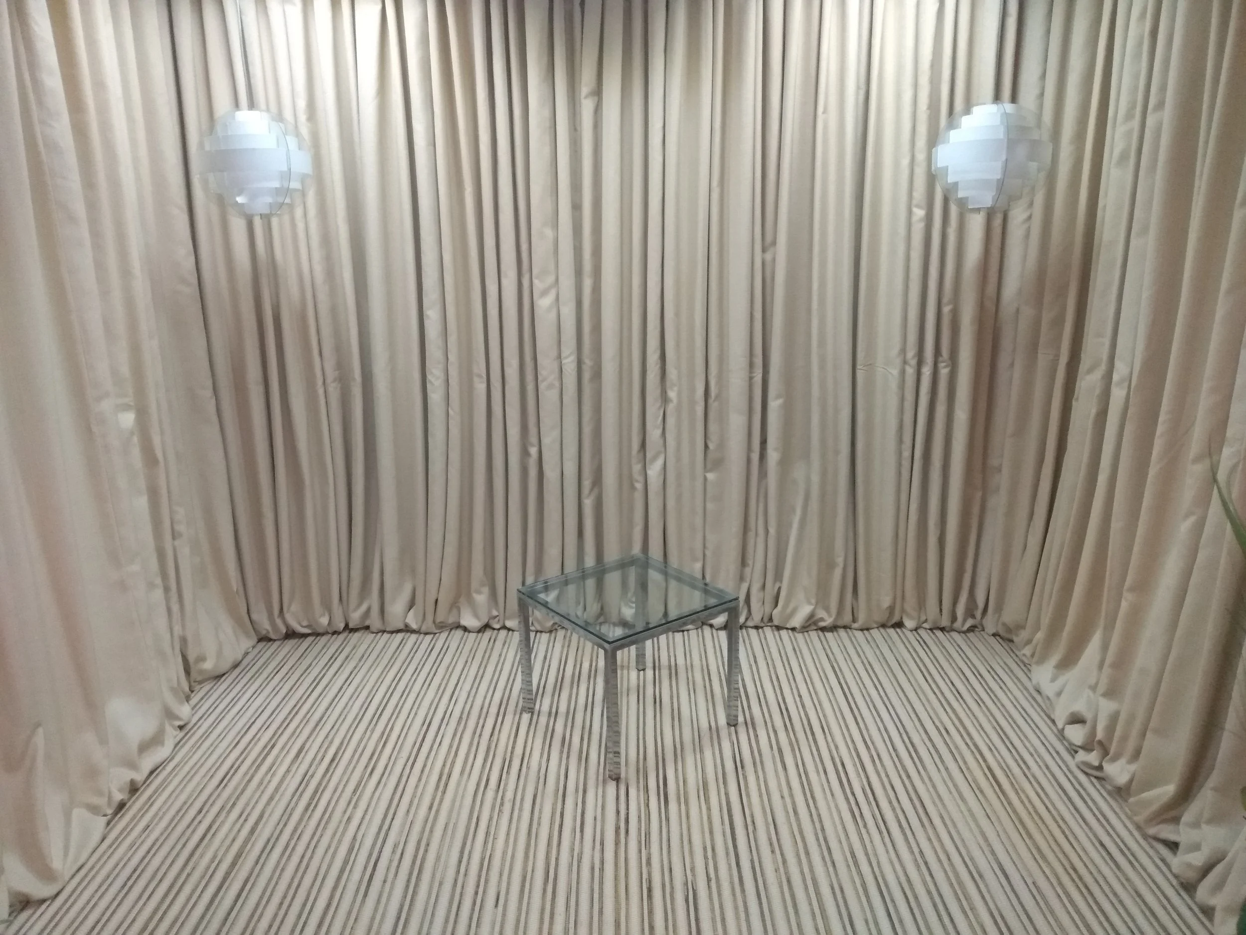 End Table / Nightstand with square polished chrome base and glass top; two available; shown grouped as coffee tables