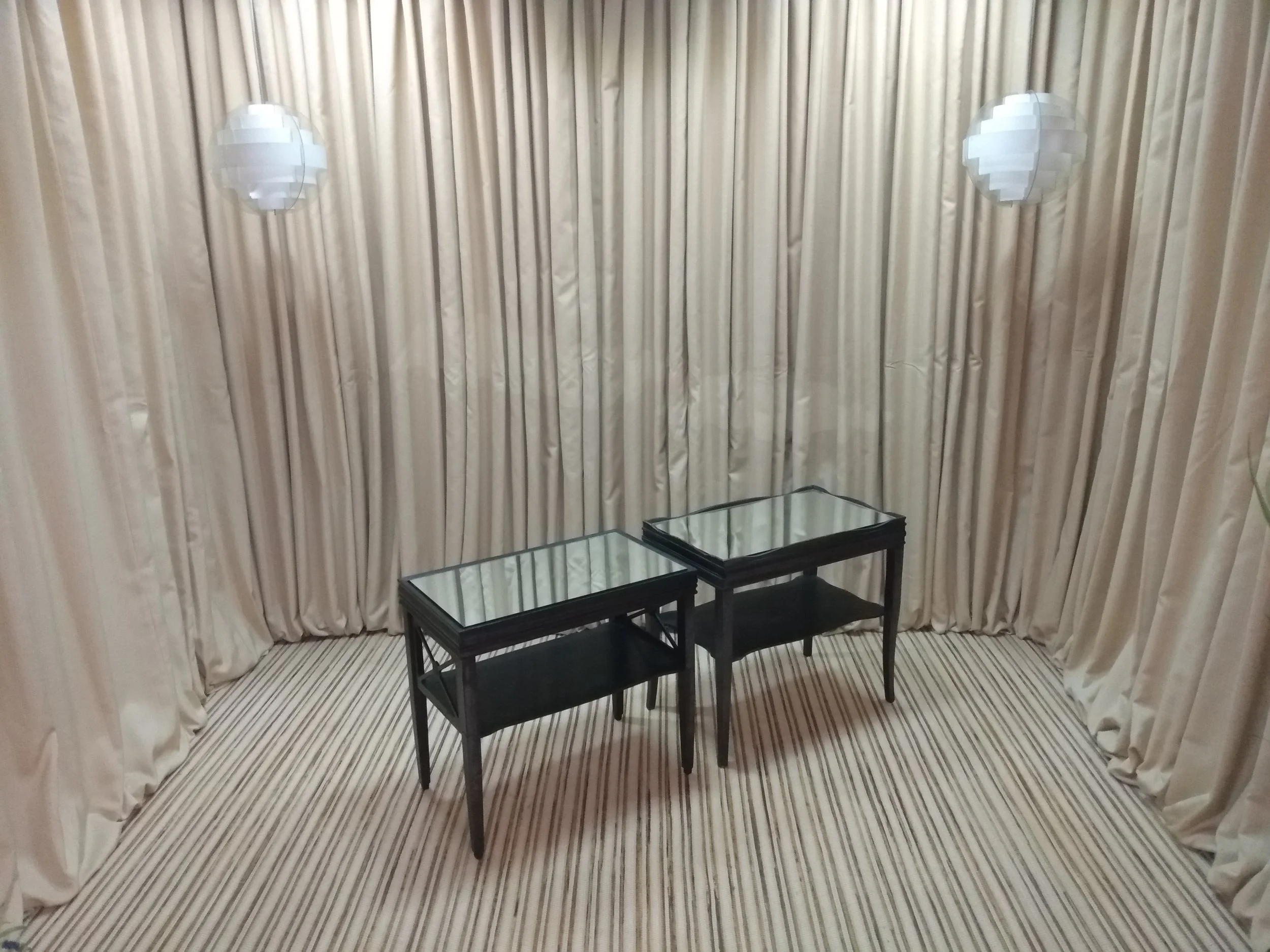 End Tables / Nightstands - one with scalloped gallery edge and shelf; one with X-side detail and straight lines, mirrored tops, espresso wood finish; one each available