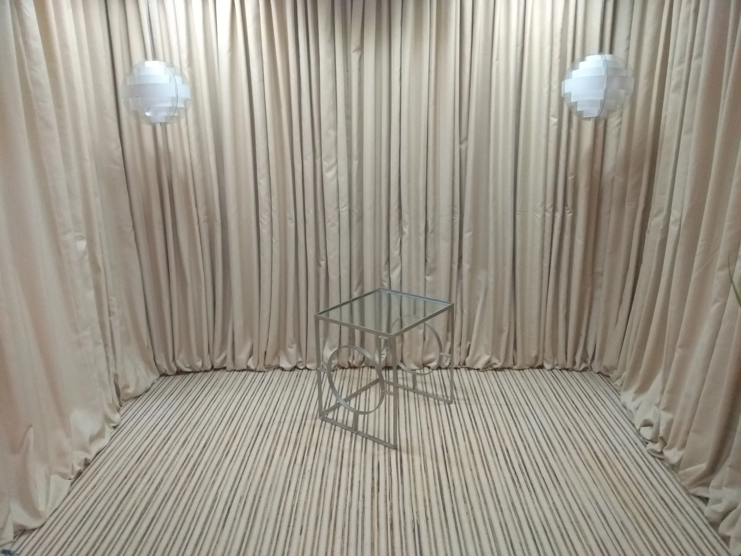 End Table / Nightstand with open geometric stainless steel frame and glass top; one available