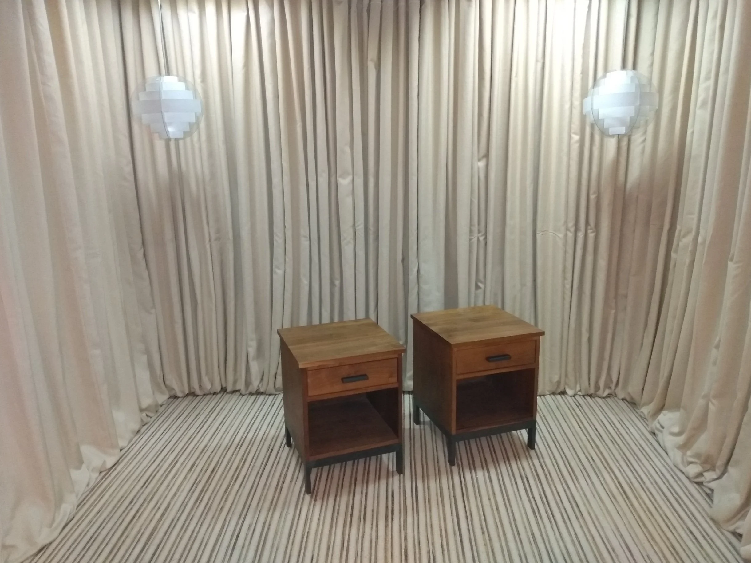 End Tables / Nightstands with natural recessed wood top and black steel base two available in graduated sizes