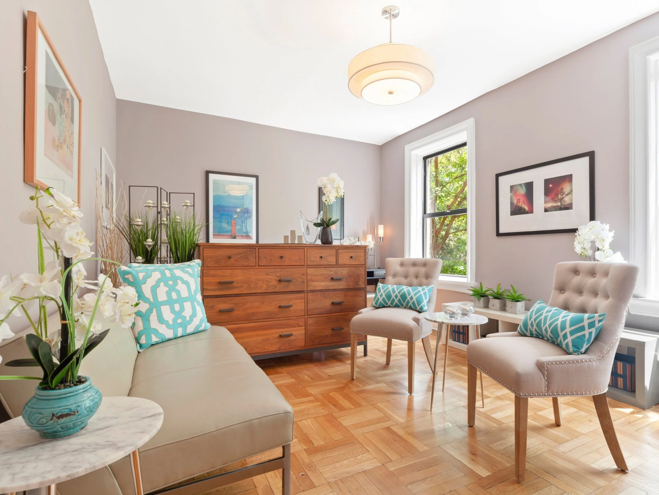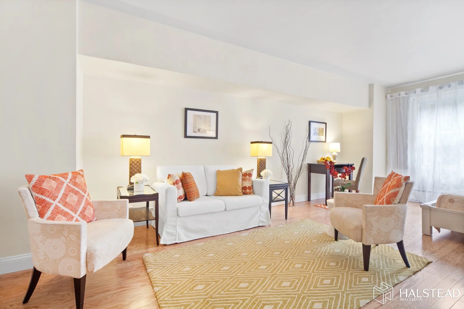 End Table / Nightstand in petite scale with white and gray marble top and three tapered chrome legs; two available; shown in Studio apartment Living Area as end tables